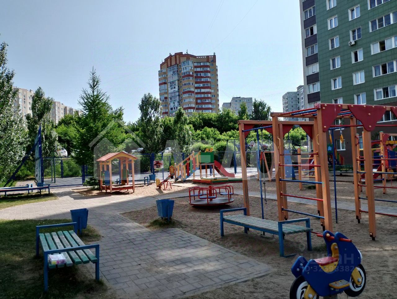Во дворе современная площадка с различными игровыми зонами для детей любых возрастных категорий.