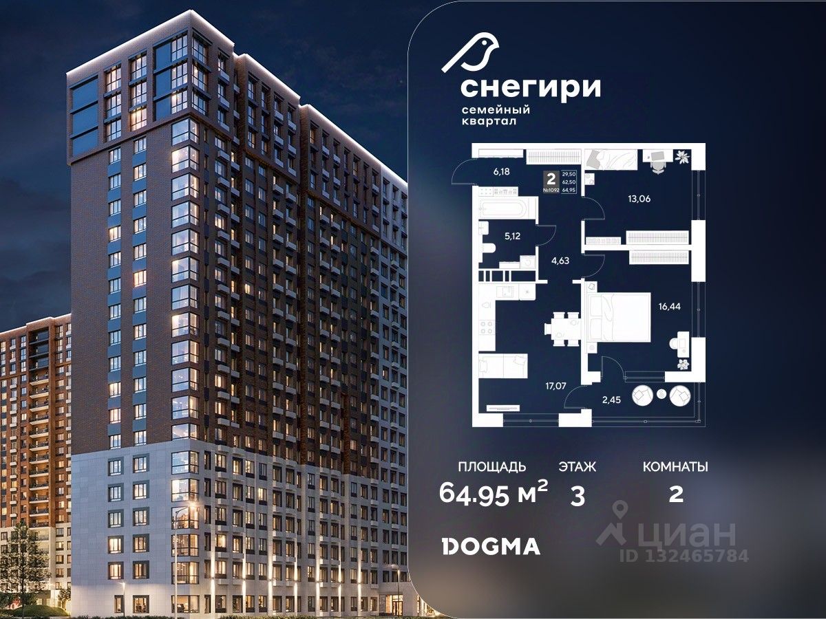Срок сдачи: 4 кв. 2027, общей площадью 64.95 кв.м., на 3 этаже.