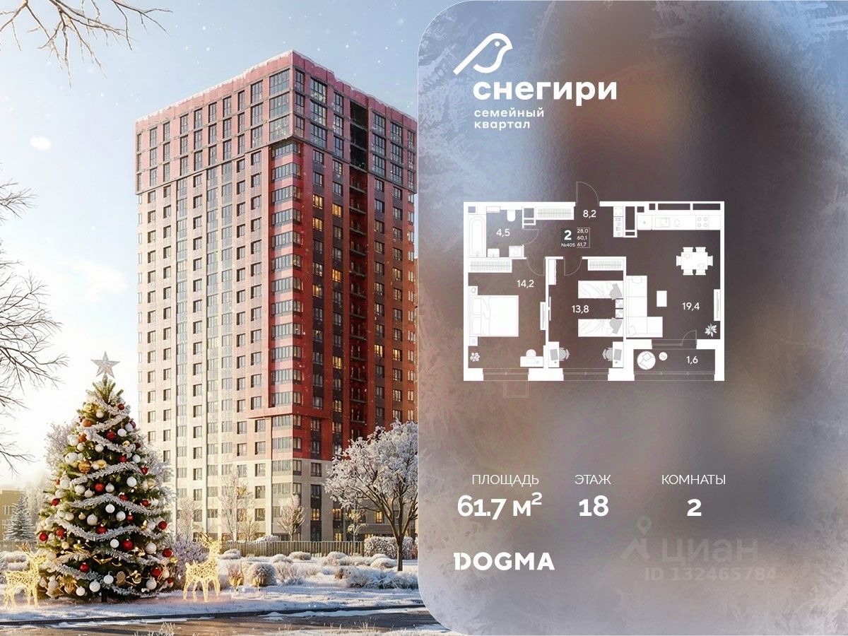 В продаже 2-комнатная квартира от застройщика DOGMA! ЖК ''Снегири'', г. Омск, Литер 1 Срок сдачи: (4 кв. 2027, общей площадью 61.7 кв.м., на 18 этаже.) Район для счастливой жизни