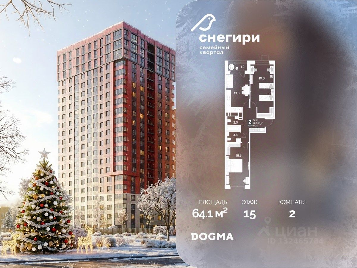 В продаже 2-комнатная квартира от застройщика DOGMA! ЖК ''Снегири'', г. Омск, Литер 1 Срок сдачи: (4 кв. 2027, общей площадью 64.1 кв.м., на 15 этаже.) Район для счастливой жизни
