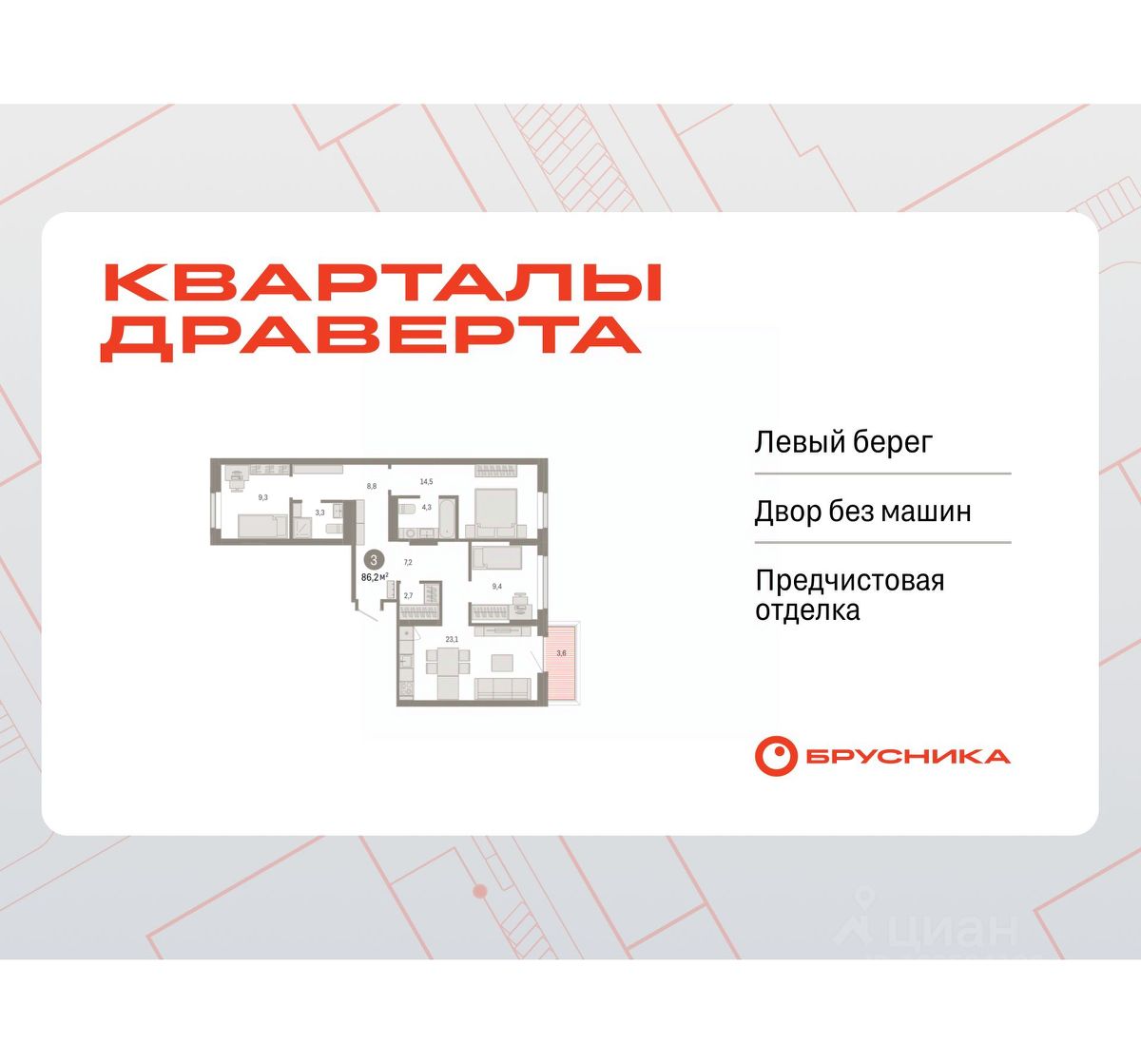 Двухкомнатная квартира от застройщика с предчистовой отделкой в Кварталы Драверта на 2 этаже. Общая площадь: 86.17 кв.м. Высота потолков 2.7 м.