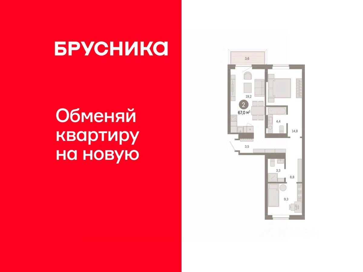 Квартира с кухней-гостиной и двумя спальнями в Кварталах Драверта. Особенности планировки: балкон, окна на две стороны, предчистовая отделка, разнесённые спальни.