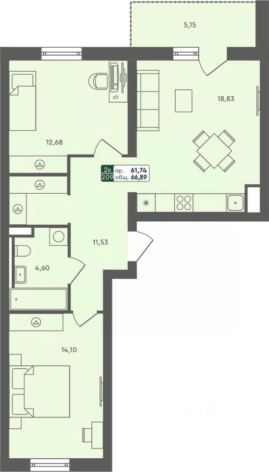 Продаётся 2-комнатная квартира в строящемся доме (ГП 2.1), срок сдачи: III-кв. 2026, общей площадью 66.89 кв.м., на 4 этаже.