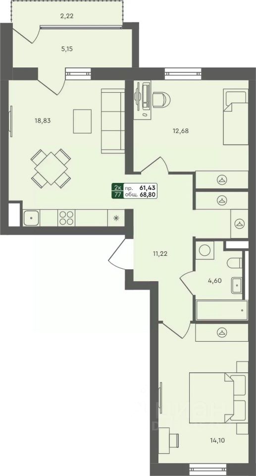 Продаётся 2-комнатная квартира в строящемся доме (ГП 2.1), срок сдачи: III-кв. 2026, общей площадью 68.8 кв.м., на 4 этаже.