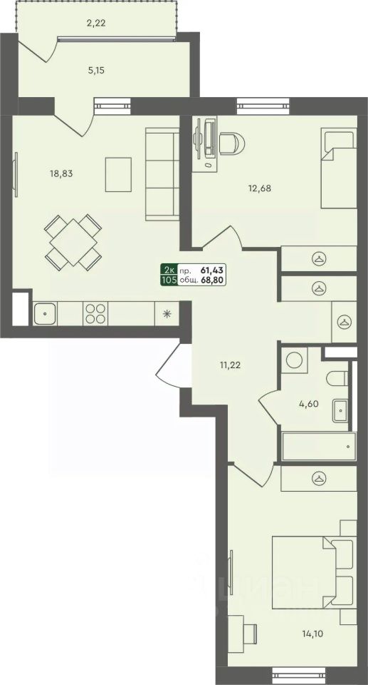 Продаётся 2-комнатная квартира в строящемся доме (ГП 2.1), срок сдачи: III-кв. 2026, общей площадью 68.8 кв.м., на 3 этаже.