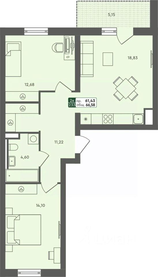 Продаётся 2-комнатная квартира в строящемся доме (ГП 2.1), срок сдачи: III-кв. 2026, общей площадью 66.58 кв.м., на 6 этаже.