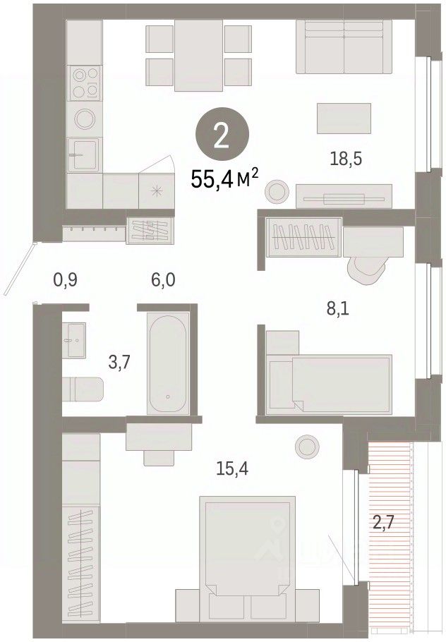 2-комн. квартира с предчистовой отделкой в Кварталы Драверта на 8 этаже. Общая площадь: 55.38 кв.м., жилая: 23.5 кв.м., площадь просторной кухни-гостиной: 18.5 кв.м. Комнаты изолированные, все окна выходят на одну сторону. В квартире одна лоджия, один совмещенный санузел. Высота потолков 2.82 м.