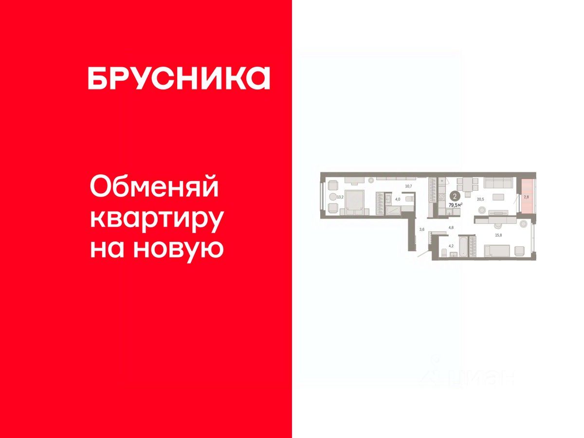 Квартира с кухней-гостиной и двумя спальнями в Кварталах Драверта. Особенности планировки: окна на две стороны, предчистовая отделка, разнесённые спальни, тёплая лоджия.