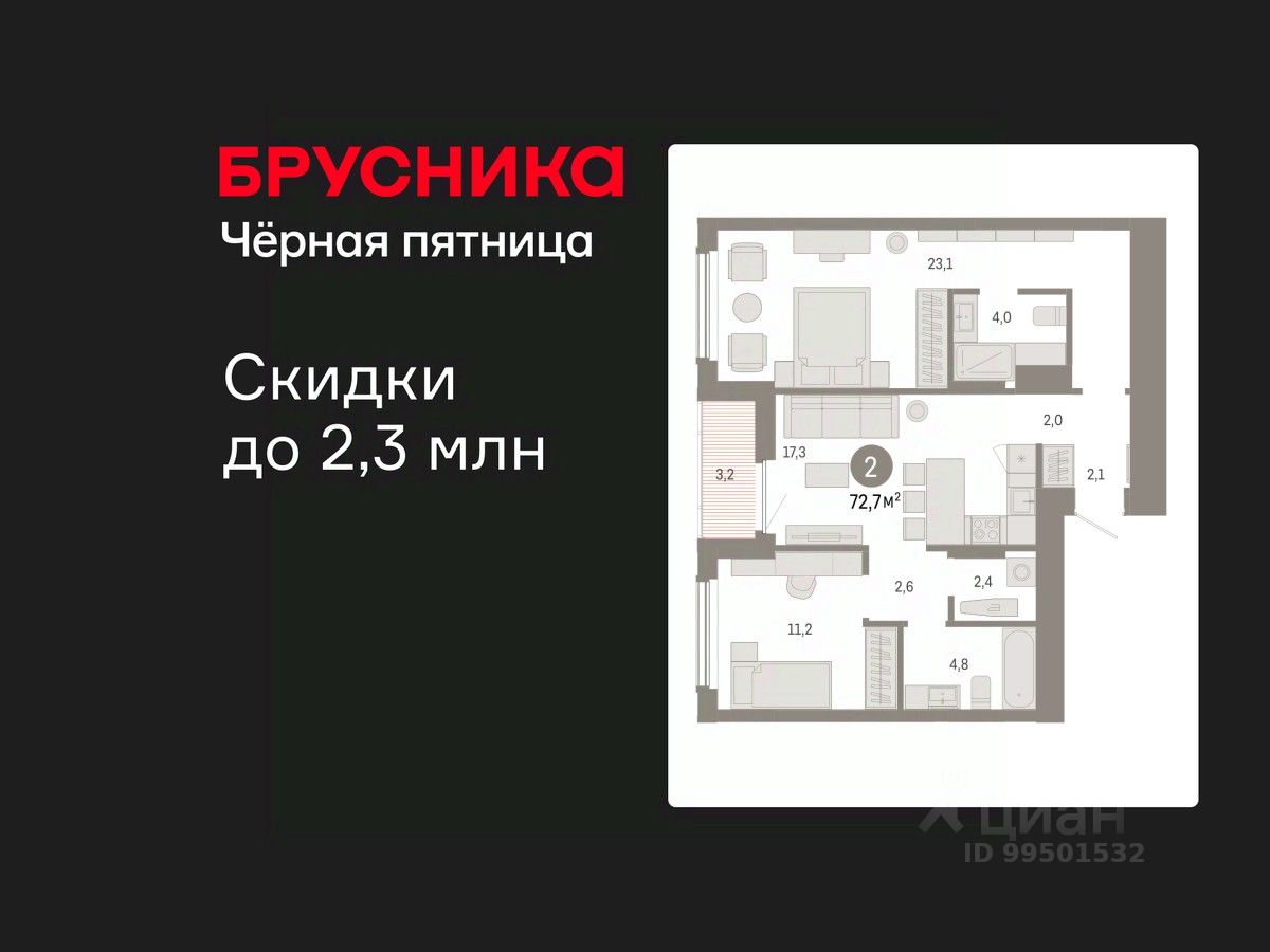 Просторная двухкомнатная квартира с предчистовой отделкой в Кварталы Драверта на 7 этаже. Общая площадь: 72.67 кв.м., жилая: 34.3 кв.м., площадь просторной кухни-гостиной: 17.3 кв.м. Комнаты изолированные, все окна выходят на одну сторону. В квартире одна лоджия, два совмещенных санузла. Высота потолков 2.82 м.