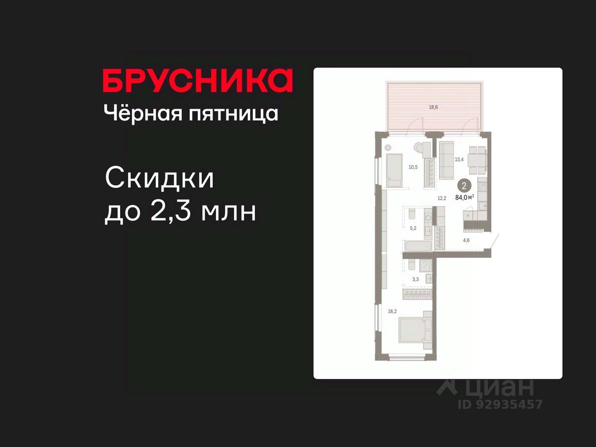 Квартира с кухней-гостиной и двумя спальнями в Кварталах Драверта. Особенности планировки: вид во двор, свободная планировка, разнесённые спальни, мастер-спальня, терраса.