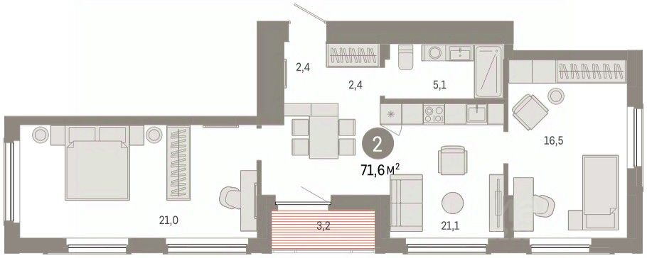 Квартира с кухней-гостиной и двумя спальнями в Кварталах Драверта. Особенности планировки: тёплая лоджия, разнесённые спальни, предчистовая отделка.