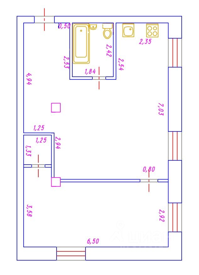 Высокие потолки 2,8 метра.