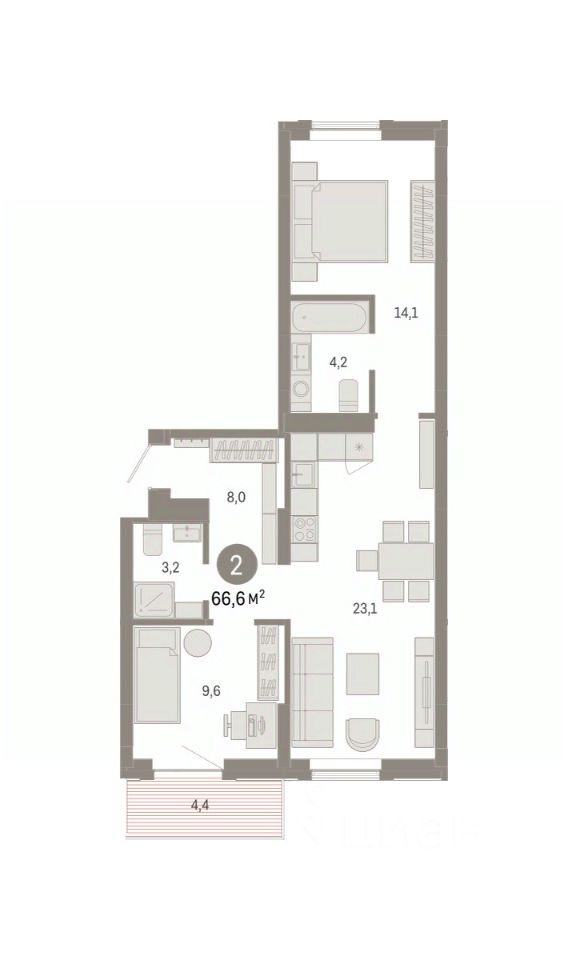 Квартира с кухней-гостиной и двумя спальнями в Кварталах Драверта. Особенности планировки: окна на две стороны, новые лоты, вид во двор, разнесённые спальни, предчистовая отделка, мастер-спальня, балкон.