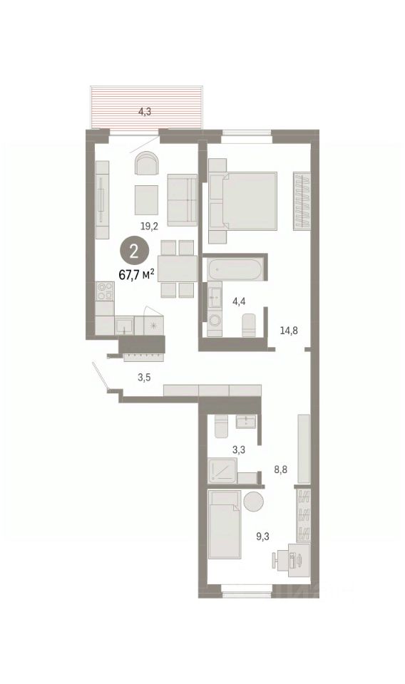 Квартира с кухней-гостиной и двумя спальнями в Кварталах Драверта. Особенности планировки: окна на две стороны, новые лоты, вид во двор, разнесённые спальни, предчистовая отделка, мастер-спальня, балкон.