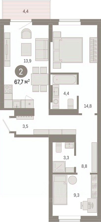 Продается двухкомнатная квартира с предчистовой отделкой в Кварталы Драверта на 3 этаже. Общая площадь: 67.69 кв.м., жилая: 24.1 кв.м., площадь просторной кухни-гостиной: 19.2 кв.м. Квартира - распашонка, без проходных комнат, окна выходят на paзные стороны дома. В квартире один балкон, два совмещенных санузла. Высота потолков 2.7 м.