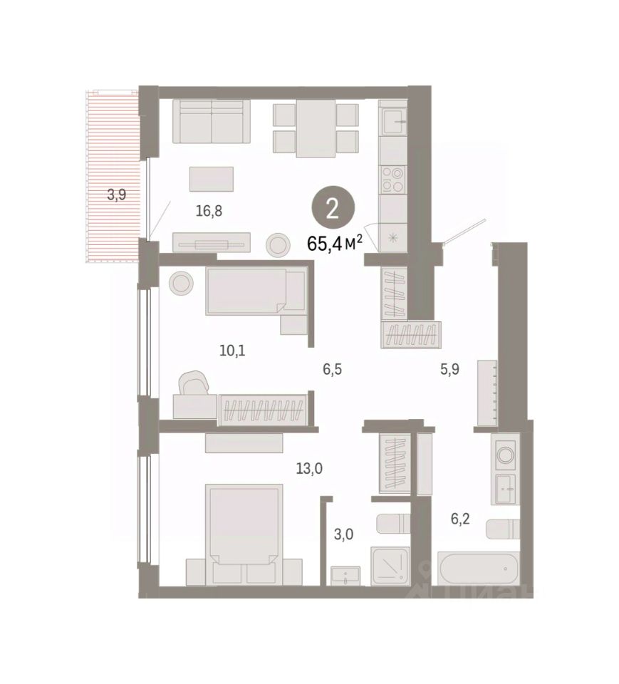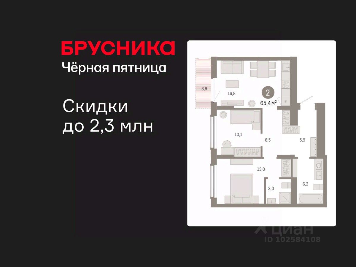 2-комн. квартира с предчистовой отделкой в Кварталы Драверта на 7 этаже. Общая площадь: 65.41 кв.м. Высота потолков 2.82 м.
