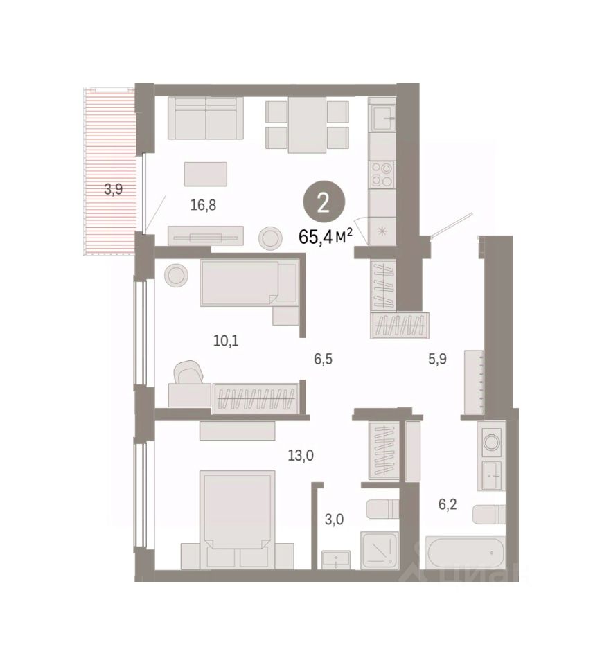 Квартира с кухней-гостиной и двумя спальнями в Кварталах Драверта. Особенности планировки: новые лоты, вид во двор, предчистовая отделка, мастер-спальня, балкон.