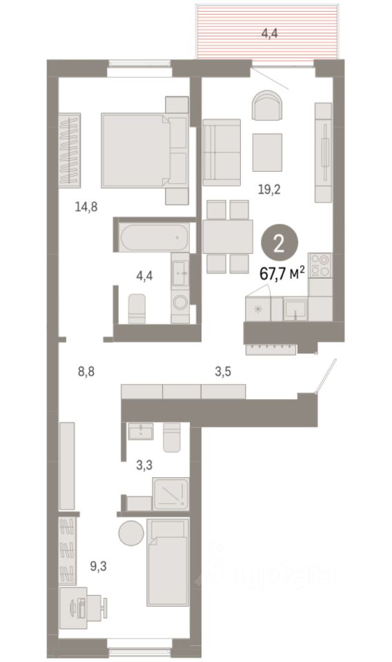 2-комн. квартира с предчистовой отделкой в Кварталы Драверта на 4 этаже. Общая площадь: 67.69 кв.м., жилая: 24.1 кв.м., площадь просторной кухни-гостиной: 19.2 кв.м. Квартира - распашонка, без проходных комнат, окна выходят на paзные стороны дома. В квартире один балкон, два совмещенных санузла. Высота потолков 2.7 м.