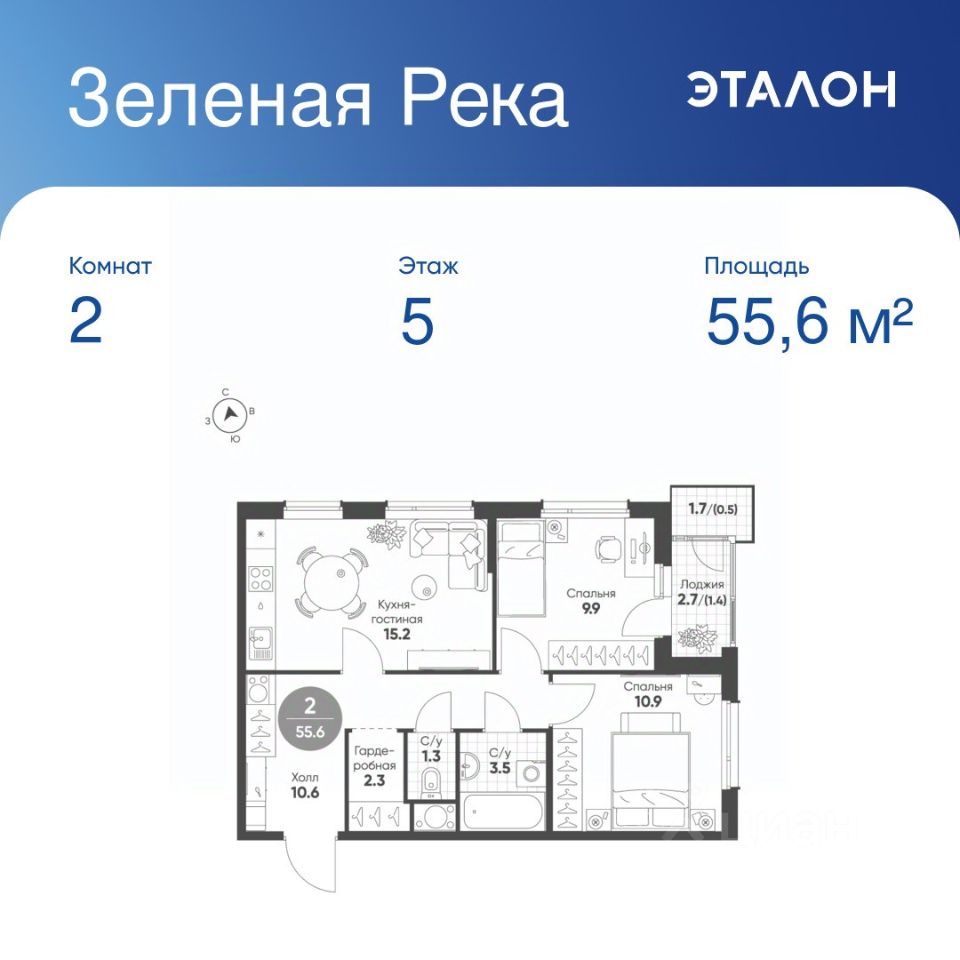 Общая площадь квартиры — 55.6 кв. м, этаж 5 из 6.
