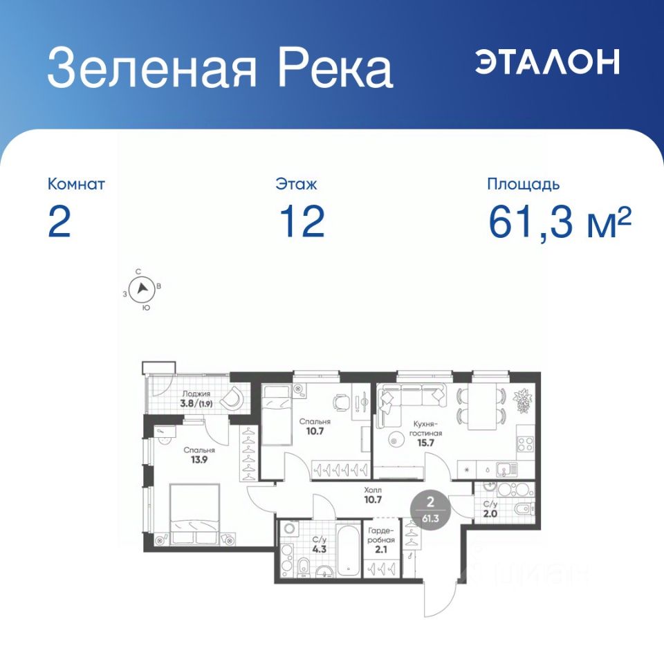 Общая площадь квартиры — 61.3 кв. м, этаж 12 из 15.