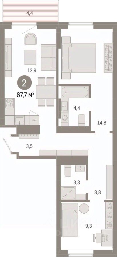2-комн. квартира от застройщика с предчистовой отделкой в Кварталы Драверта на 4 этаже. Общая площадь: 67.69 кв.м., жилая: 24.1 кв.м., площадь просторной кухни-гостиной: 19.2 кв.м. Квартира - распашонка, без проходных комнат, окна выходят на paзные стороны дома. В квартире один балкон, два совмещенных санузла. Высота потолков 2.7 м.