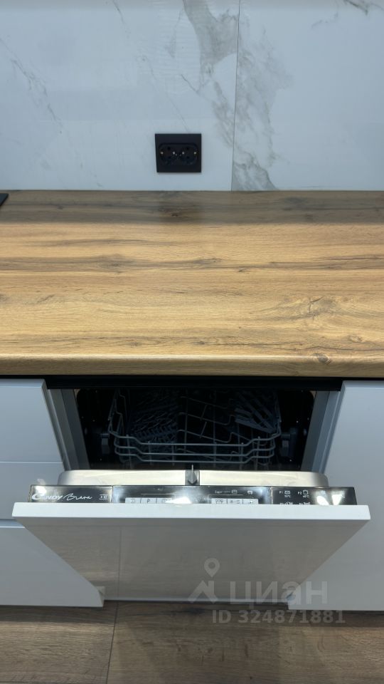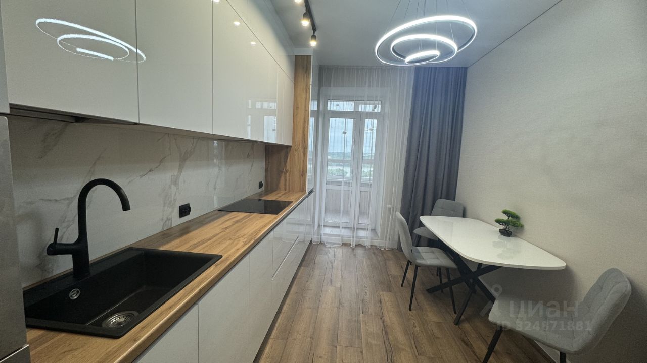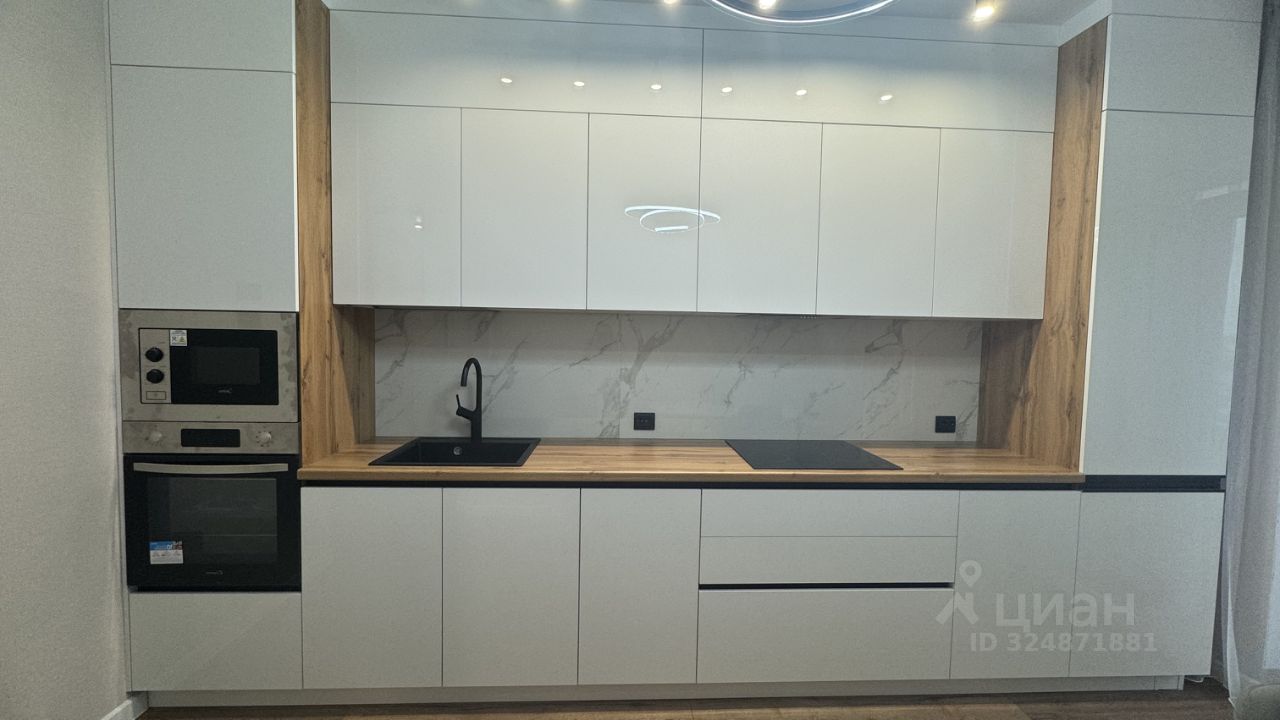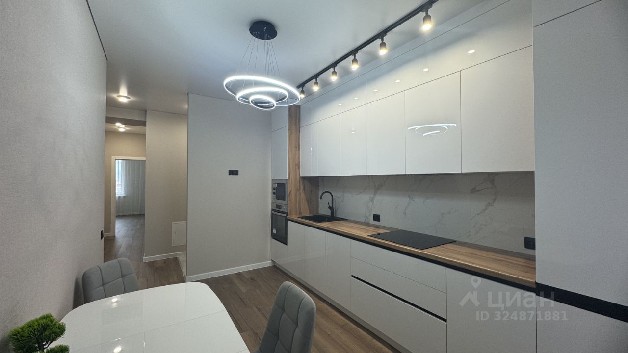 -Встроенный кухонный гарнитур с необходимой техникой (духовой шкаф, варочная панель, вытяжка, посудомоечная машина, микроволновая печь) предусмотрен шкаф для встроенного холодильника. Обеденная зона с мягкими стульями.
