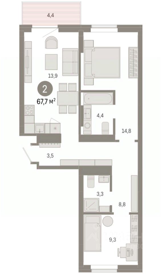 Квартира с кухней-гостиной и двумя спальнями в Кварталах Драверта. Особенности планировки: мастер-спальня, окна на две стороны, предчистовая отделка.