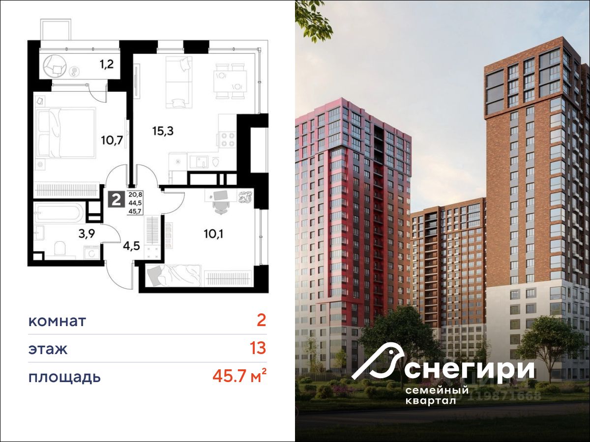 ЖК ''Снегири'', г. Омск, корпус 1 Срок сдачи: (4 кв. 2027, общей площадью 45.7 кв.м., на 13 этаже.)