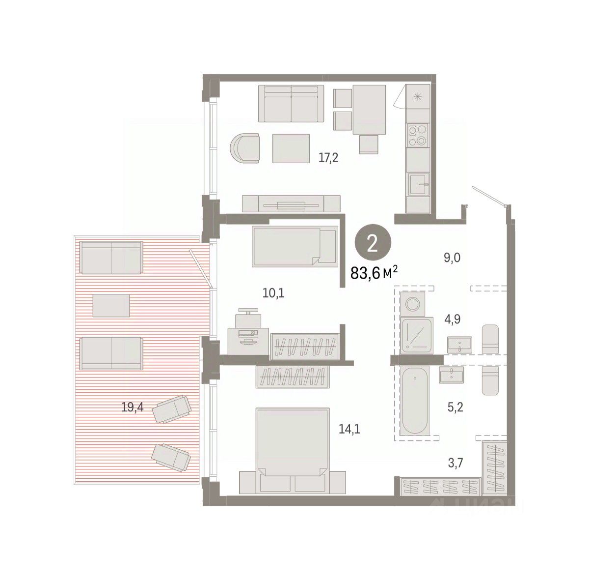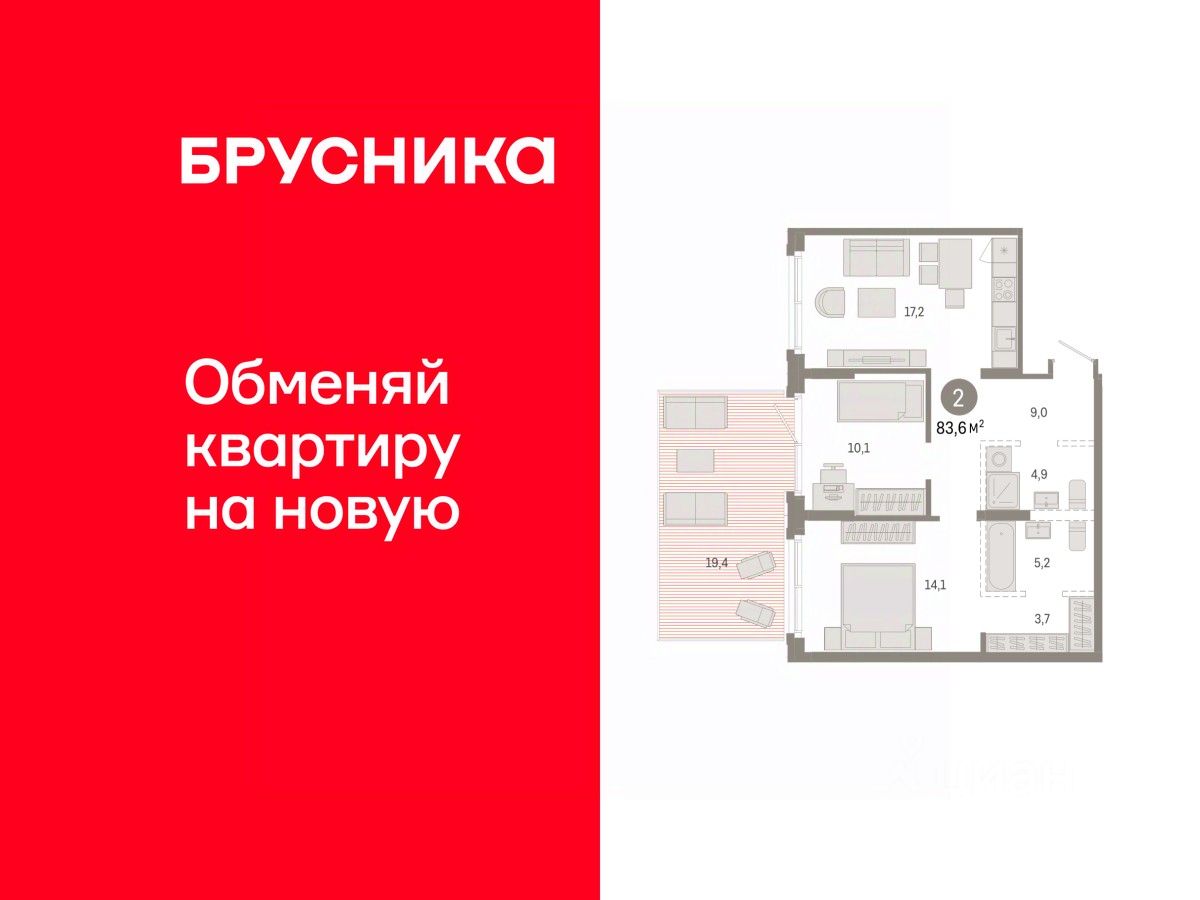 Квартира с кухней-гостиной и двумя спальнями в Кварталах Драверта. Особенности планировки: предчистовая отделка.
