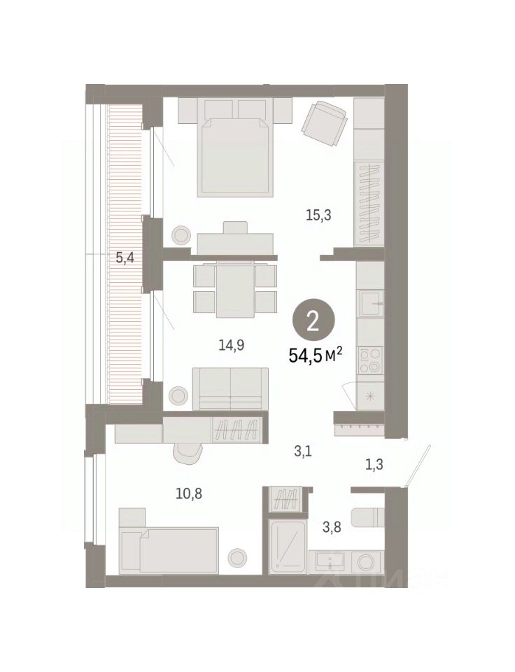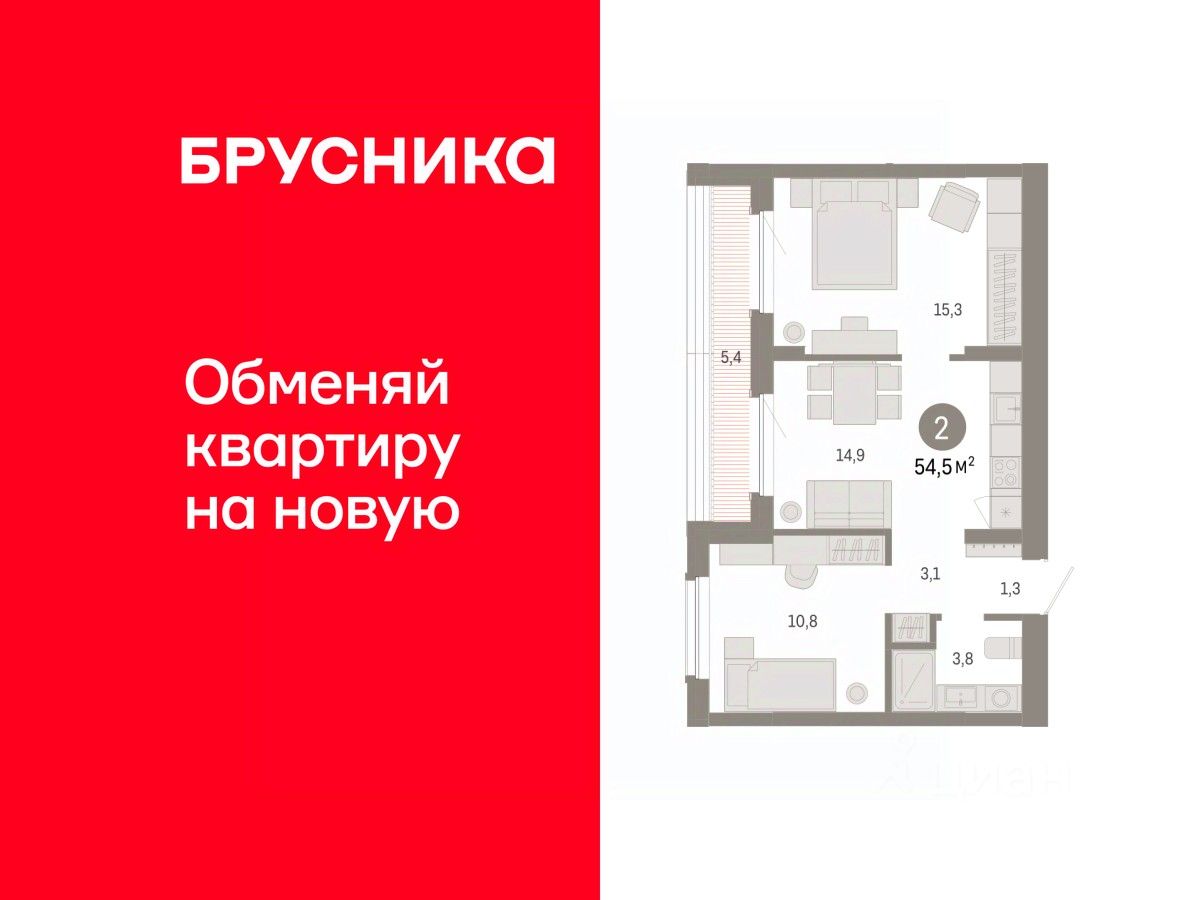 Квартира с кухней-гостиной и двумя спальнями в Кварталах Драверта. Особенности планировки: предчистовая отделка, разнесённые спальни, терраса на крыше.