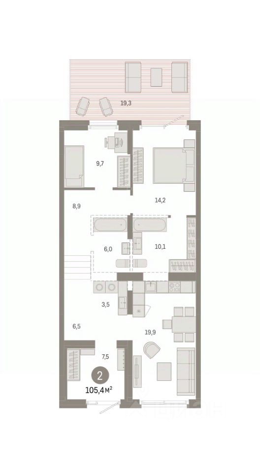 Продается двухкомнатная квартира с предчистовой отделкой в Кварталы Драверта на 1 этаже. Общая площадь: 105.43 кв.м. Высота потолков 2.7 м.