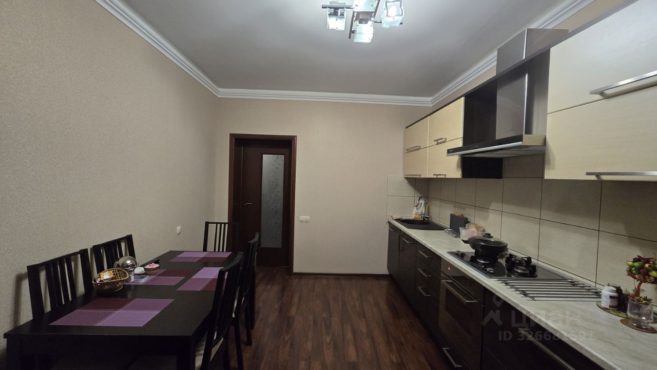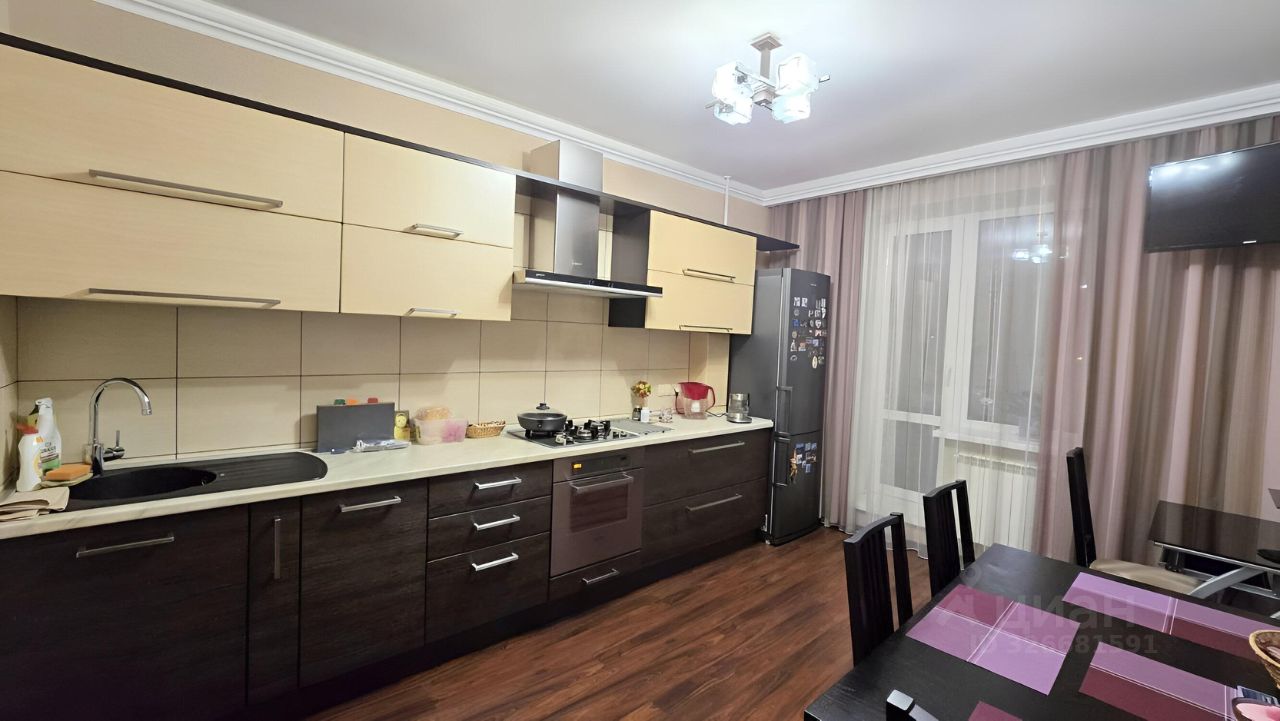 На полу по всей квартире ламинат, в санузле плитка. В квартире остается встроенный угловой шкаф-купе в коридоре, кухонный гарнитур со встроенной бытовой техникой (электрический духовой шкаф, газовая поверхность, посудомоечная машина), спальный гарнитур.