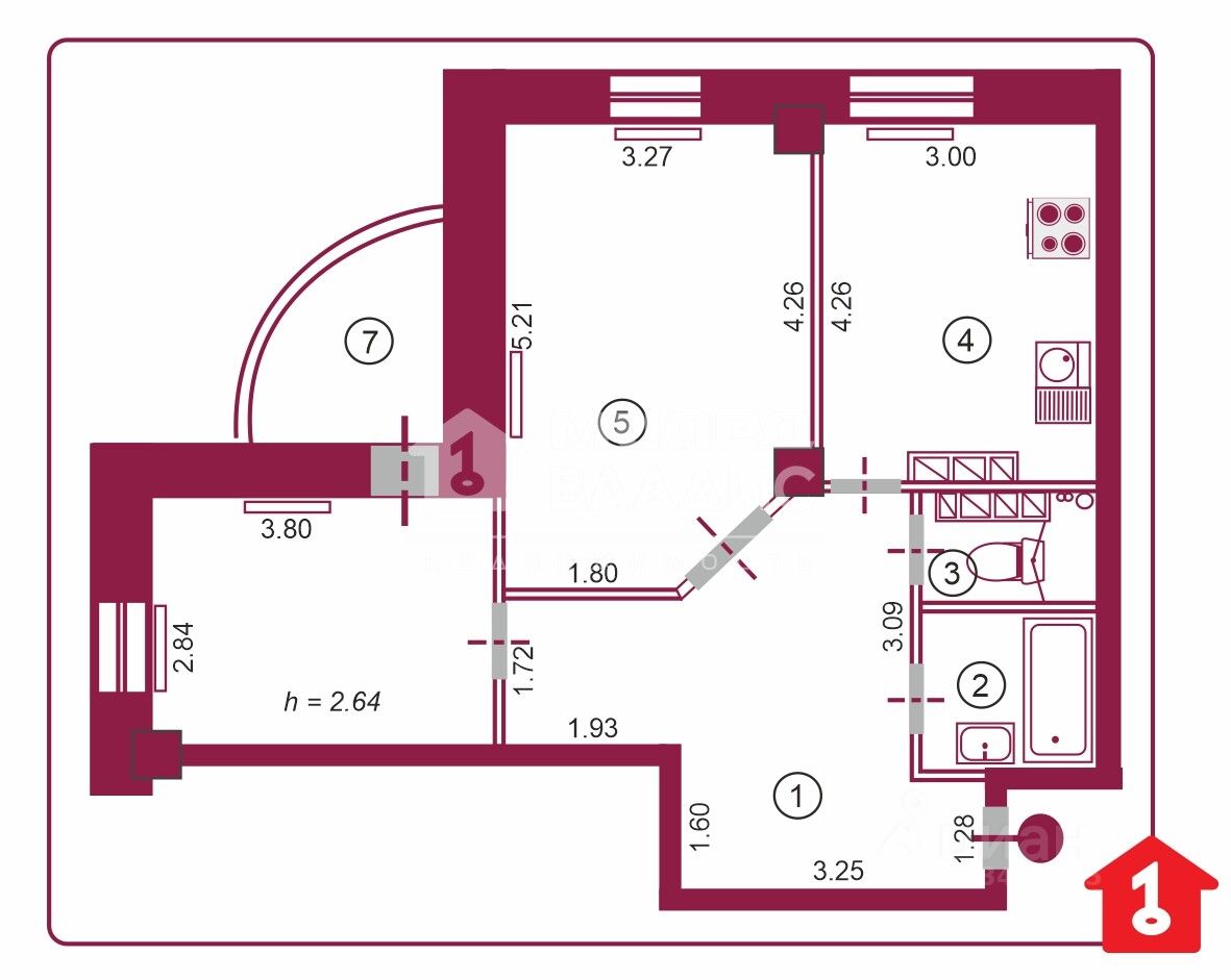 Квартира расположена на 13 этаже 17-этажного кирпично-монолитного дома, построенного в 2013 году. Общая площадь квартиры составляет 58 кв. м, из которых 26,7 кв. м — жилая, 12 кв. м — кухня. Две изолированные комнаты имеют площадь 10,7 кв. м и 16 кв. м соответственно. Просторная прихожая 14.3 кв.м, вмещает большой шкаф-купе - практически гардеробная. В квартире два раздельных санузла, что добавляет удобства для всей семьи. Также есть застекленная лоджия, где можно устроить небольшую зону отдыха с прекрасным видом на город .