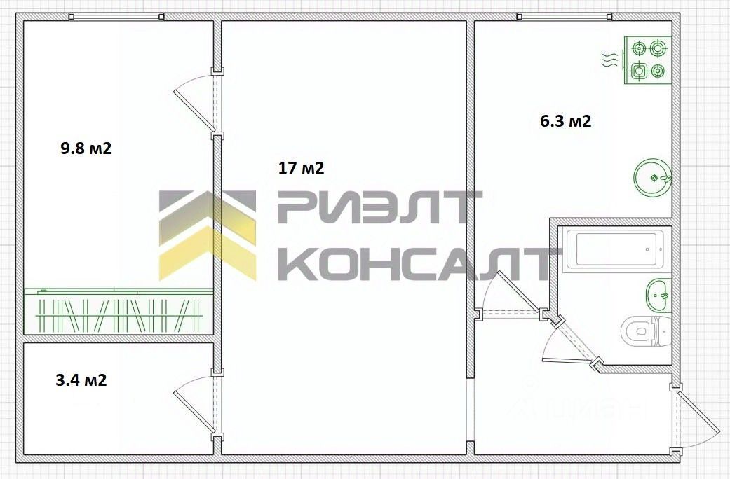 Планировка включает в себя светлую кухню правильной формы площадью 6,3 кв.м, просторную комнату 17 кв.м и комнату площадью 13,2 кв.м, санузел совмещённый.