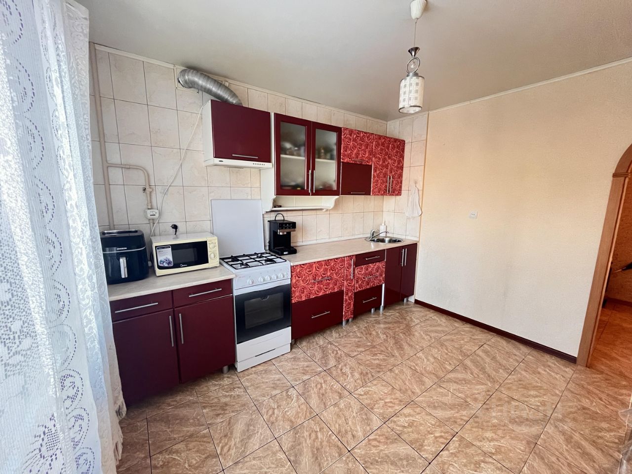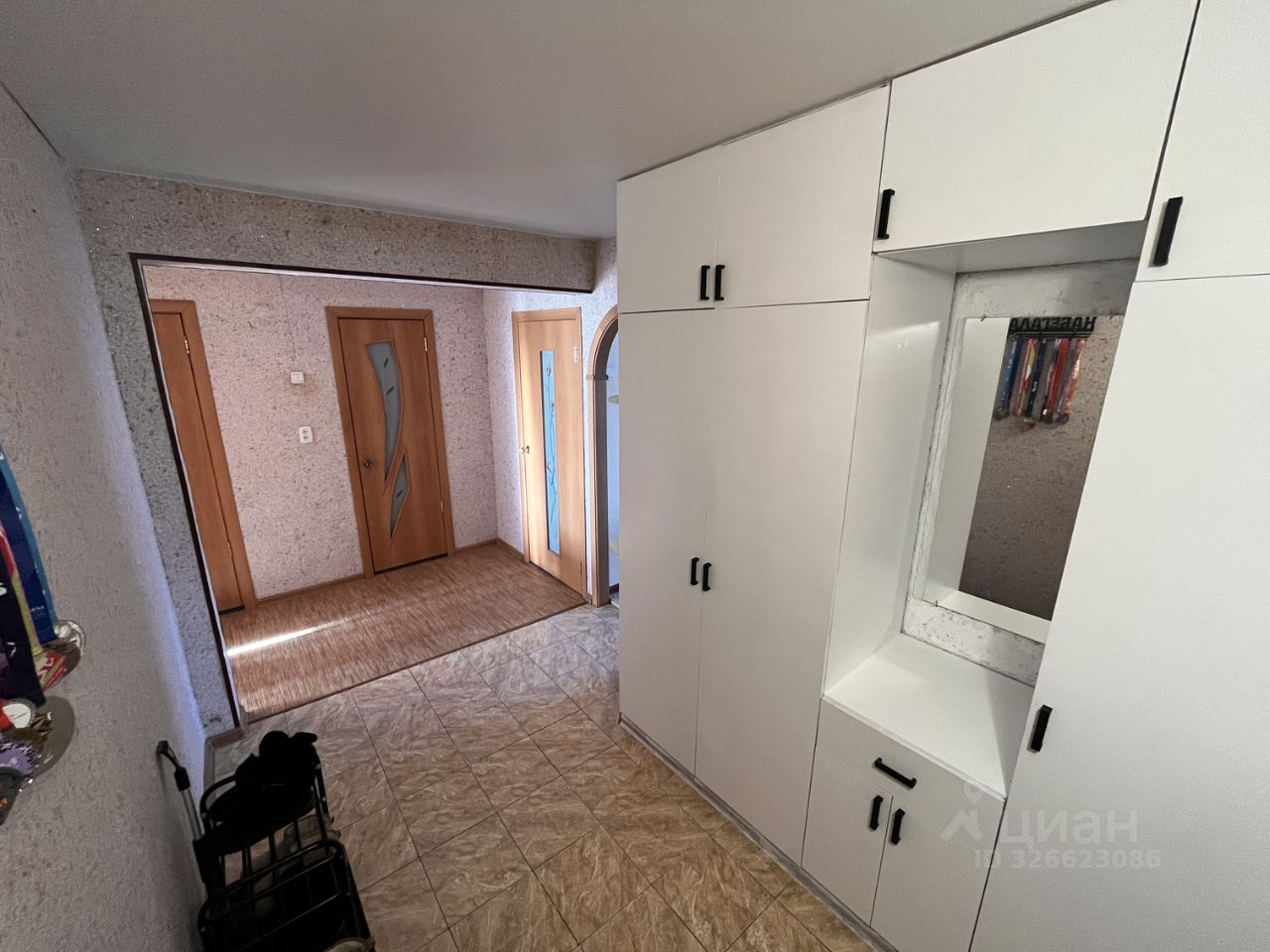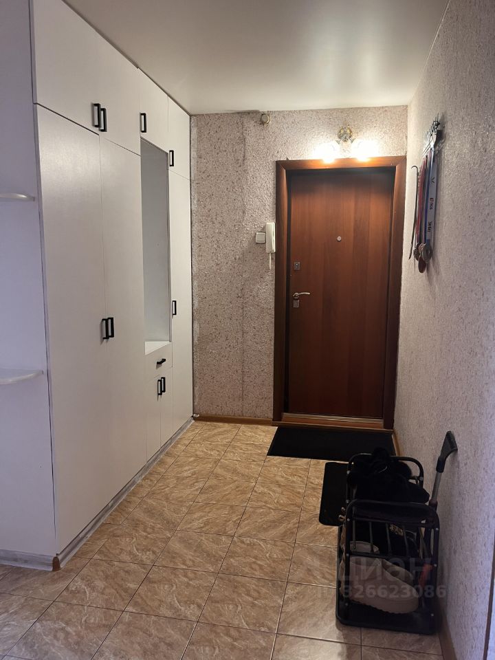 Коммуникации заменены. Натяжные потолки. В квартире остается встроенный шкаф в коридоре и кухонный гарнитур.