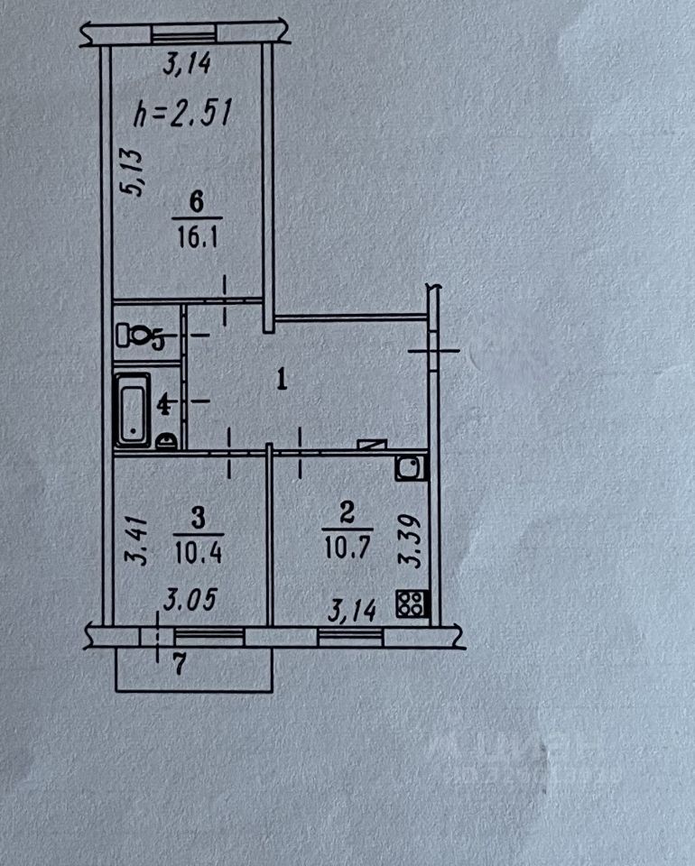 Общая площадь: 51,1 кв.м. + балкон 2,7 кв.м.