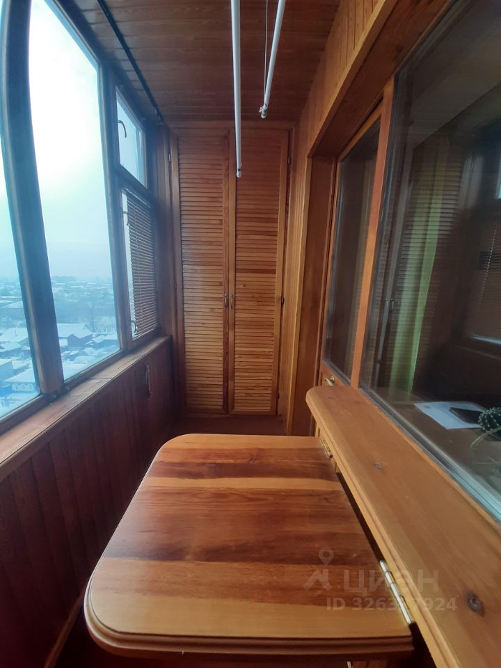 Балкон обшит деревом и застеклен. На нем очень удобный шкаф для хозяйственной необходимости.