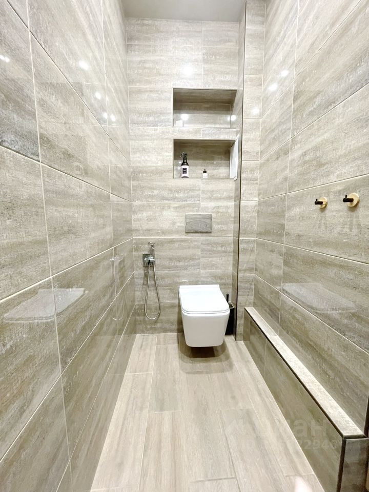 Туалет и ванная выполнены из качественных материалов с дорогой сантехникой.