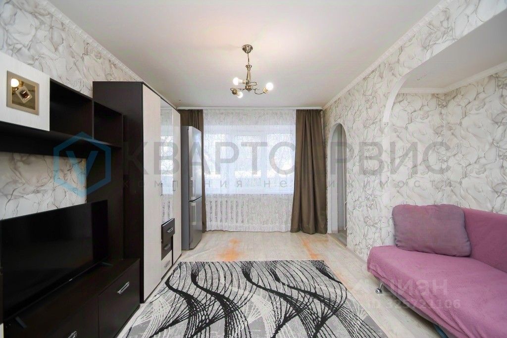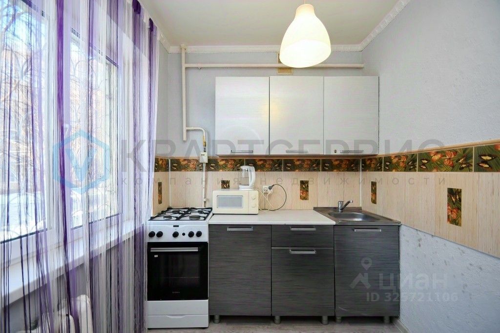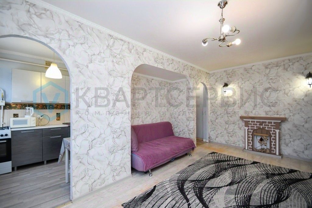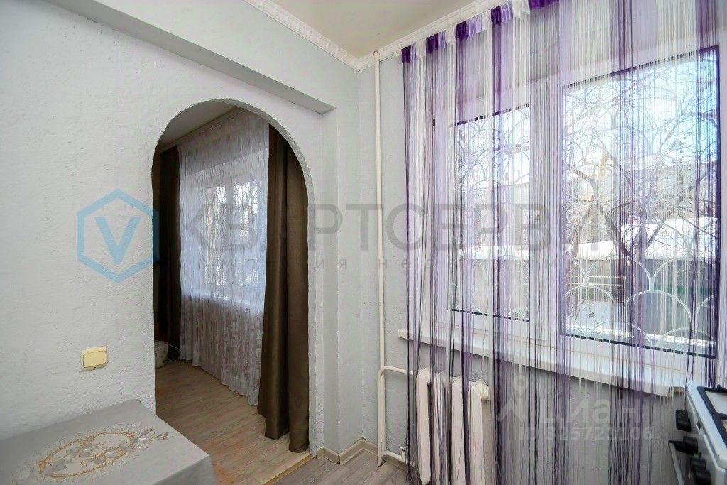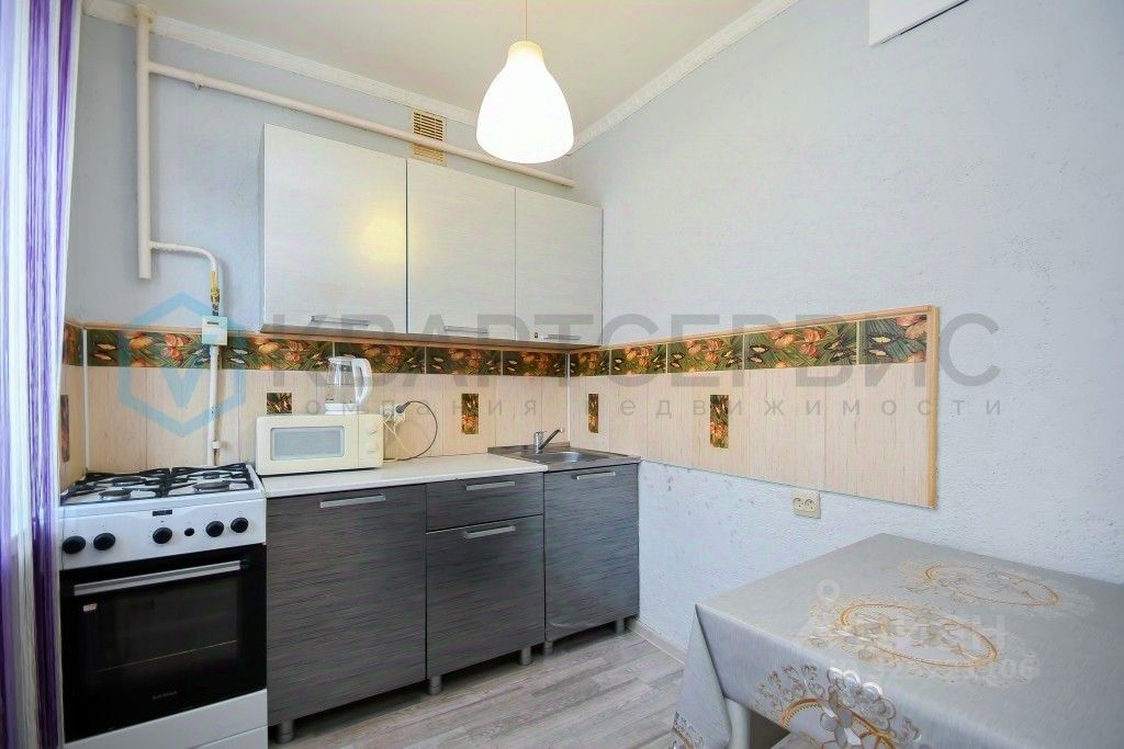 Квартира готова к проживанию: установлены хорошие окна, санузел облицован кафелем, на полу линолеум, остается кухонный гарнитур, шкаф в спальне.