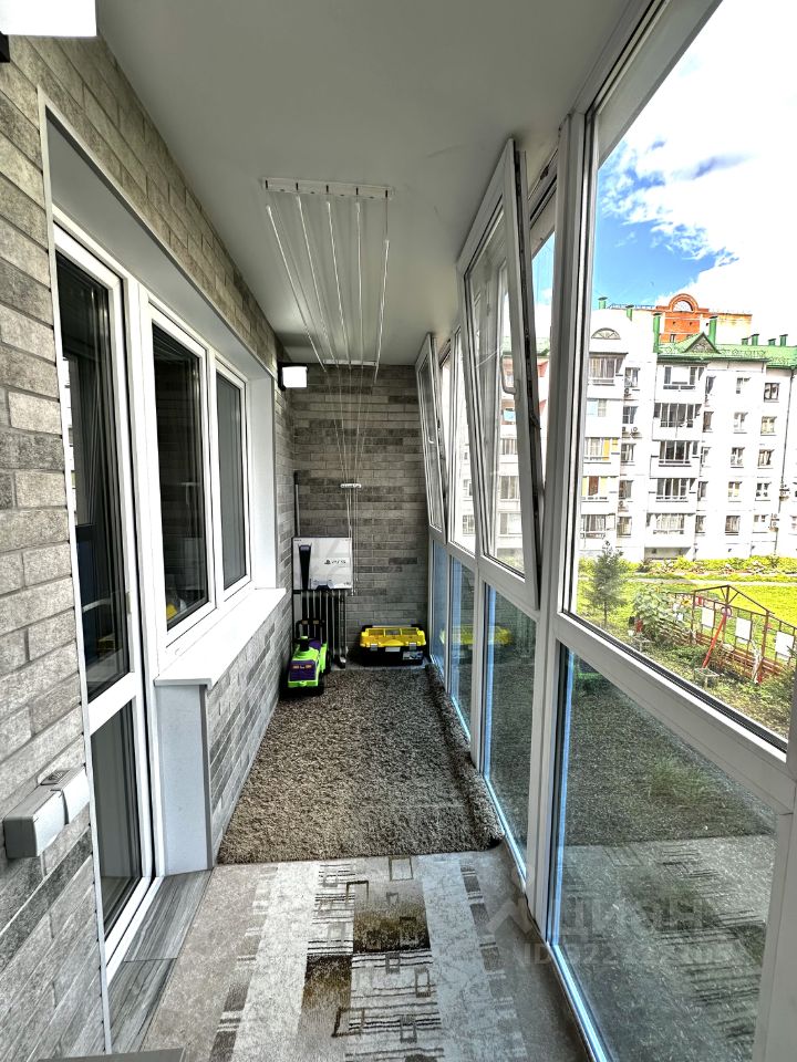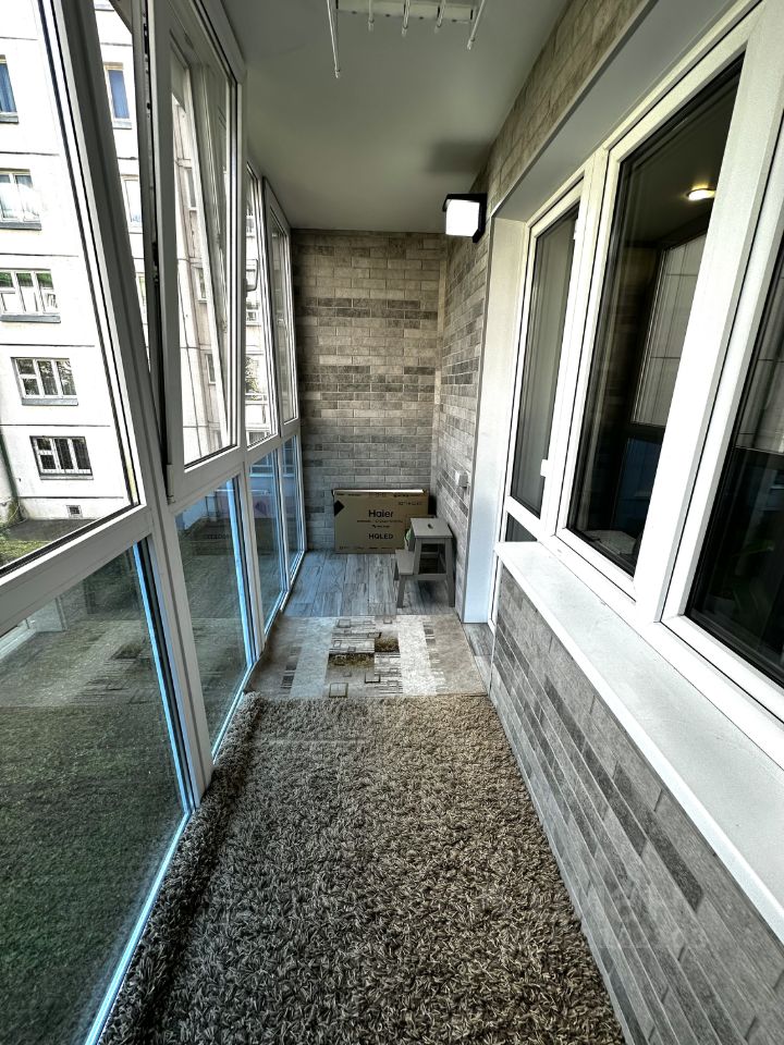Балкон с французским остеклением. Выполнена отделка изнутри, заведено электричество. Оборудовано место для отдыха