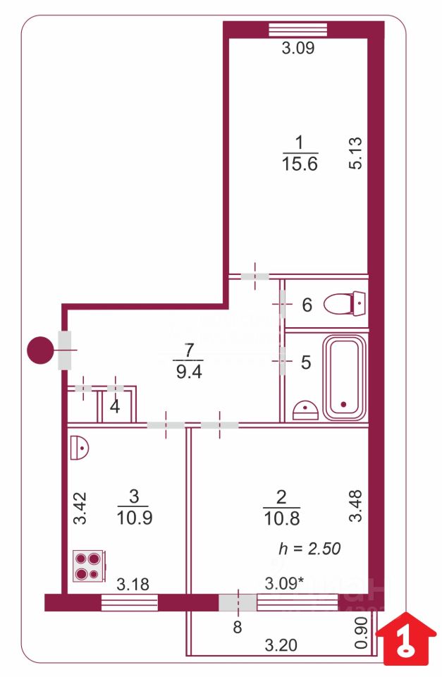 Жилая площадь составляет 26,4 кв. м, большая кухня площадью — 10,9 кв. м. Комнаты изолированы — 15,6 и 10,8 кв.м. Окна выходят на улицу и во двор. Есть балкон. Квартира с косметическим ремонтом, что позволяет новым владельцам сразу заселиться или обновить интерьер по своему вкусу.
