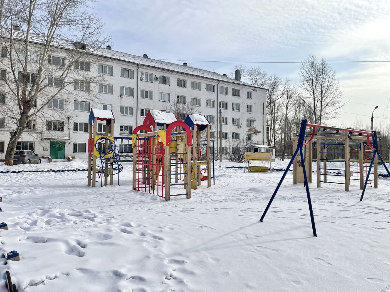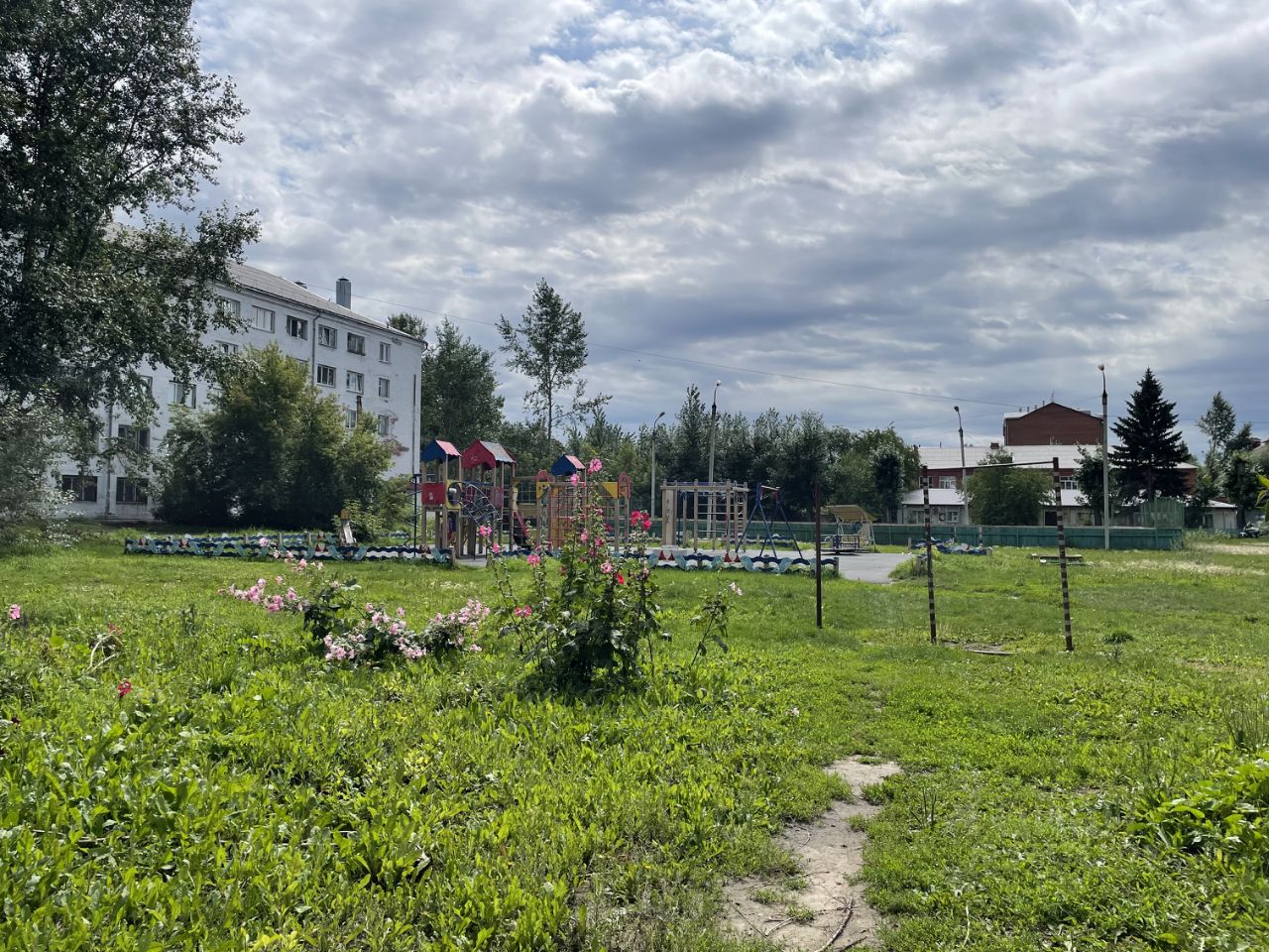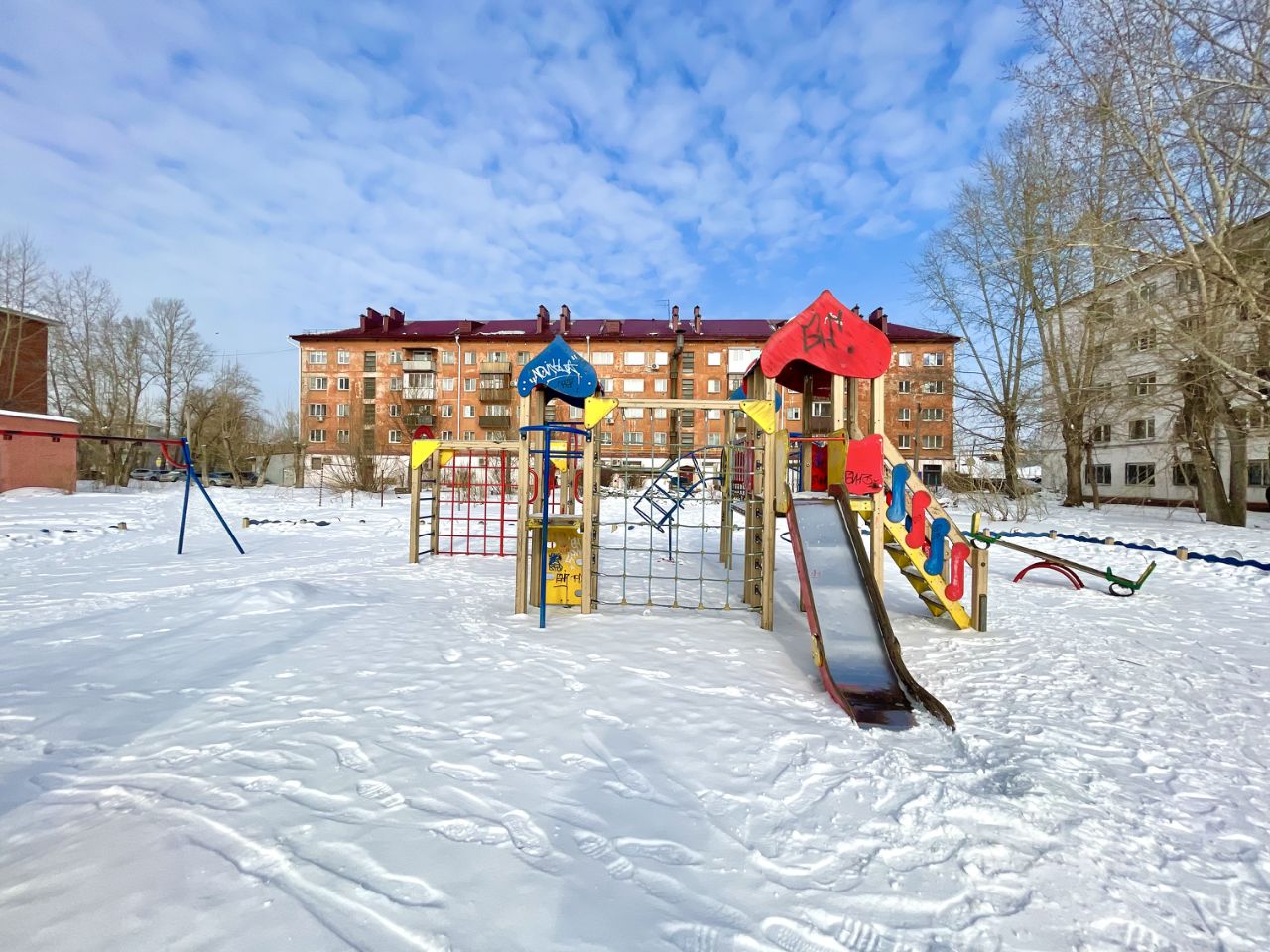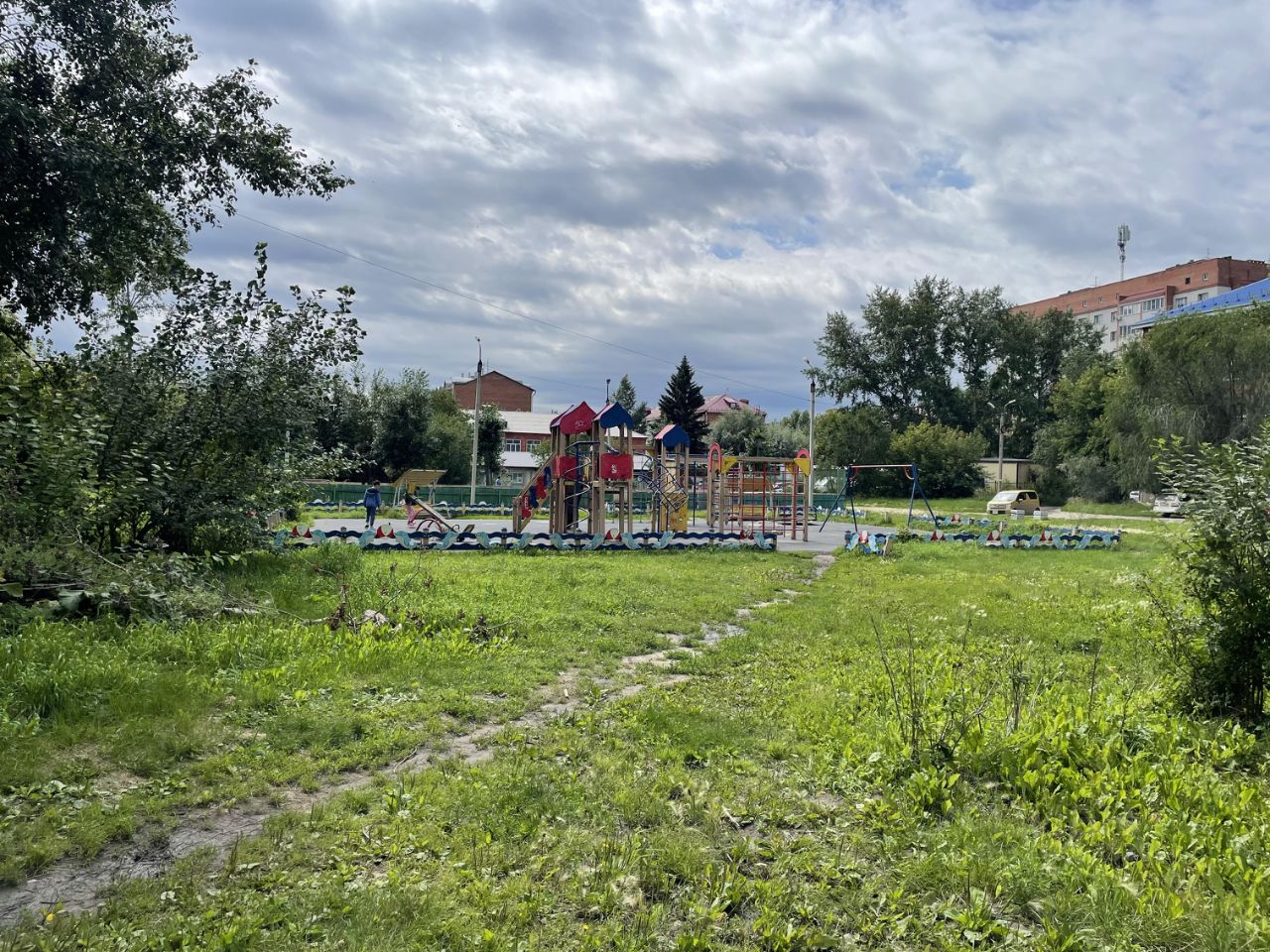 Во дворе современная детская площадка.