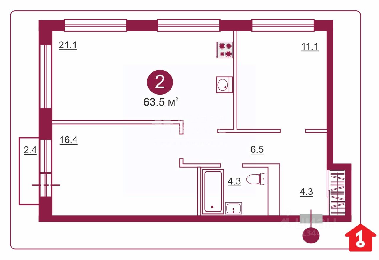 Квартира расположена на 14 этаже 17-этажного кирпично-монолитного дома, построенного в 2025 году. Высота потолков 2,8 метра создаёт ощущение простора. Общая площадь квартиры — 63,5 кв. м, из которых 27,5 кв. м — жилая площадь. Две комнаты изолированы и имеют площадь 16,4 кв. м и 11,1 кв. м соответственно. Кухня площадью 21 кв. м станет местом для семейных ужинов и дружеских встреч. Межкомнатные перегородки выполнены из гипсокартона, на полу цементно-песчаная стяжка, электрическая разводка по квартире проведена, сделаны выводы под сантехнику, установлены радиаторы отопления и приборы учета. ''Двор без машин''- такова концепция застройщика. Сразу высажены крупномеры, разбиты цветники, прекрасно организован детский и в целом семейный отдых.