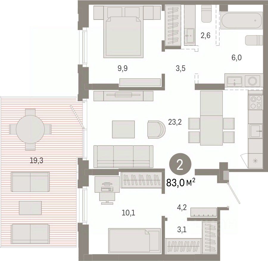 Квартира с кухней-гостиной и двумя спальнями в Кварталах Драверта. Особенности планировки: ипотека 4,6%, второй санузел, гардеробная, окна в пол, вид во двор, панорамное остекление, разнесённые спальни, ипотека 3,5%, предчистовая отделка, мастер-спальня, терраса.