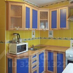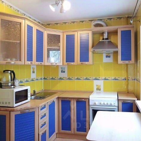Кухня представлена в яркой цветовой гамме, насыщенной жизнерадостностью и положительной энергией. Она оснащёна всей необходимой современной бытовой техникой.