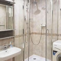 Ванную комнату отличает современный интерьер с функциональной душевой кабиной и качественной сантехникой.