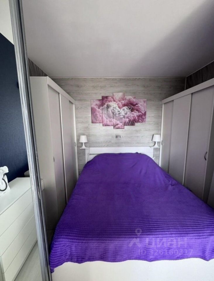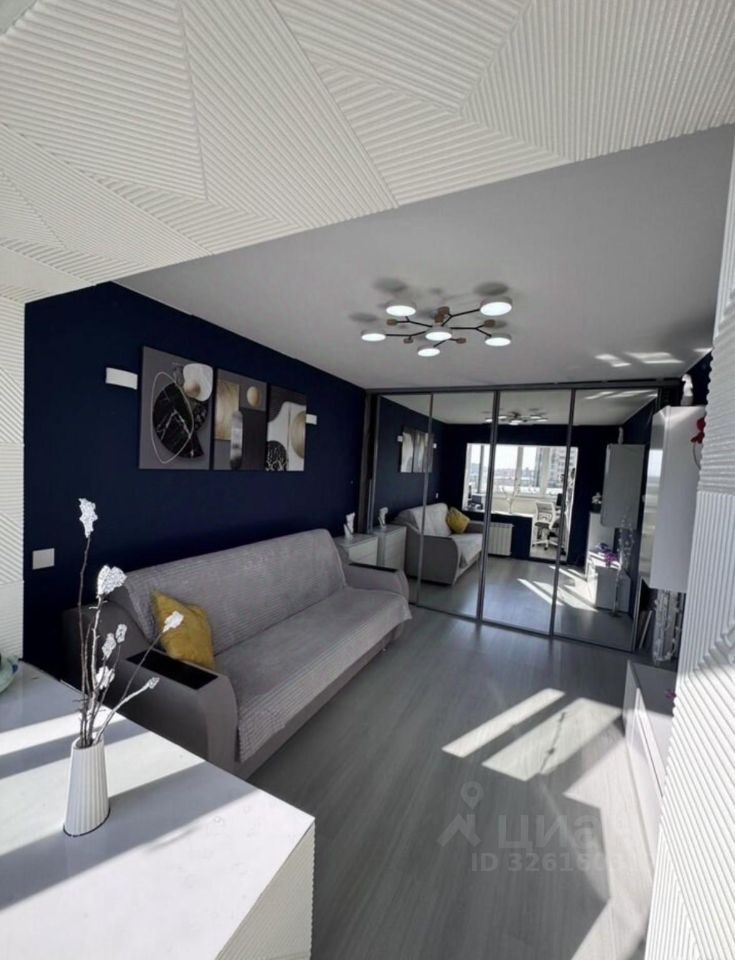 Удачная планировка и грамотное зонирование зала: выделено отдельное спальное место, отделённое большим зеркалом — решение даёт и приватность, и ощущение простора.