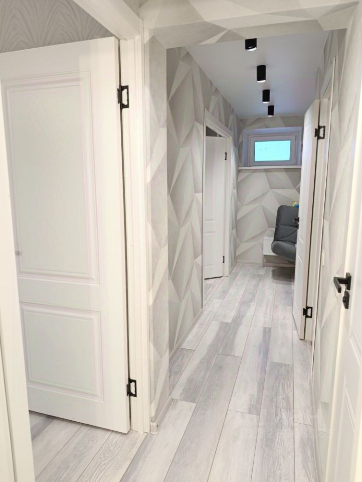 Качественный ремонт в квартире выполнен в спокойных бело - серых тонах.