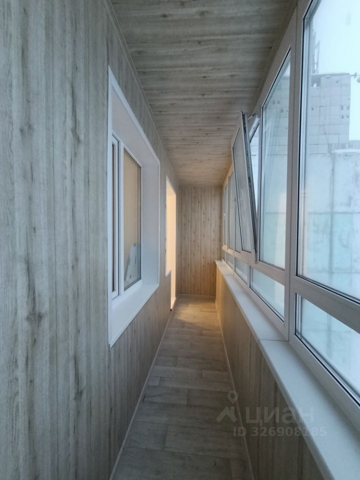 Большая остекленная лоджия на две комнаты отделана ПВХ, имеет выход с кухни.