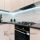 Современный кухонный гарнитур с установленной техникой (варочная поверхность, вытяжка, духовой шкаф, холодильник)